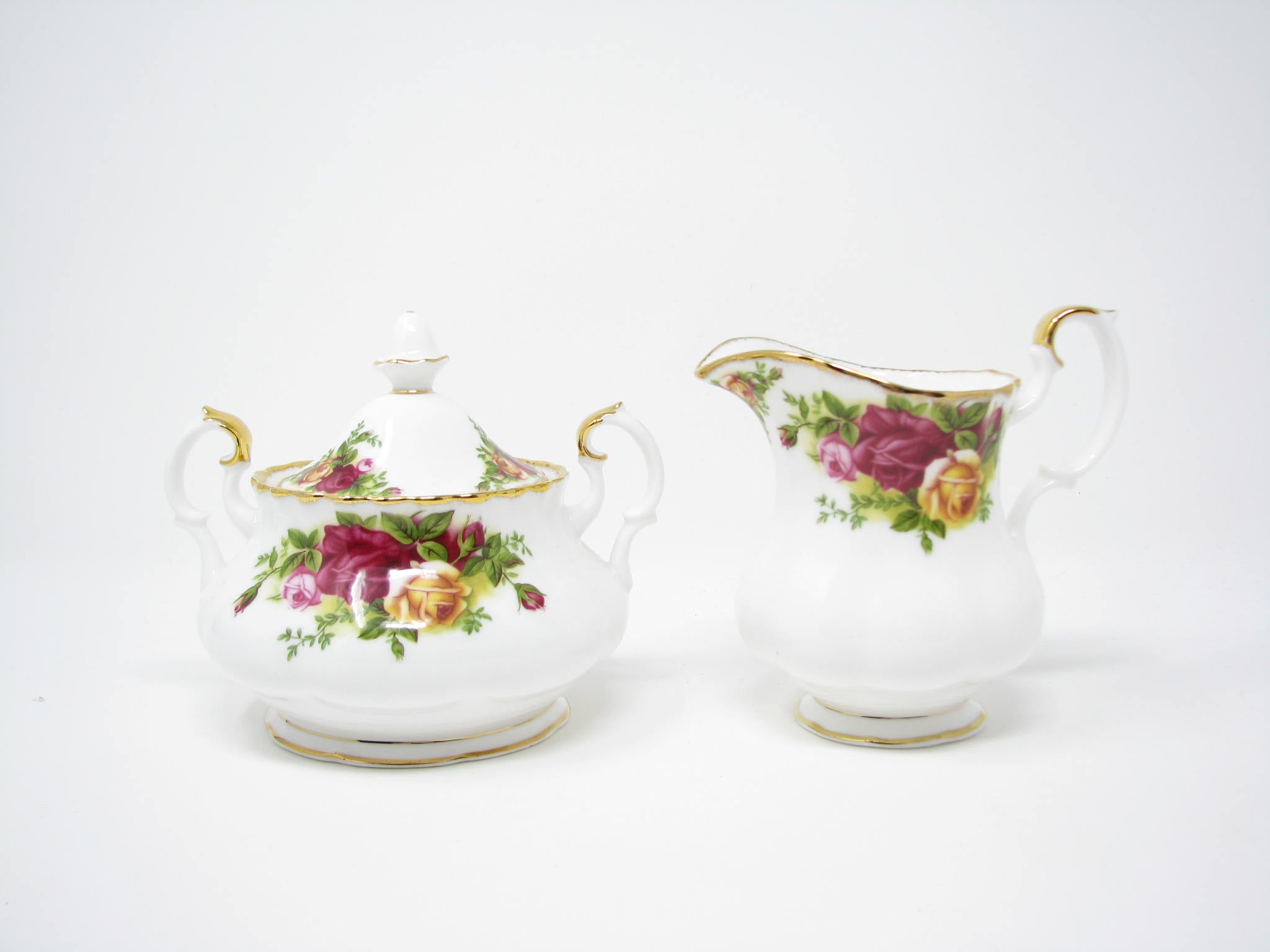 Vintage Royal Albert Old Country Roses English bone china creamer and lidded sugar bowl with rose pattern and gold trim. There are 2 sets available for purchase.