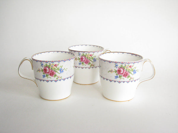 Vintage set of 3 Royal Albert Petit Point bone china mugs with floral needlepoint design. This pattern dates from 1932 and was discontinued in 2001. Based on the stamp and provenance we place the dating of these to mid 20th Century.