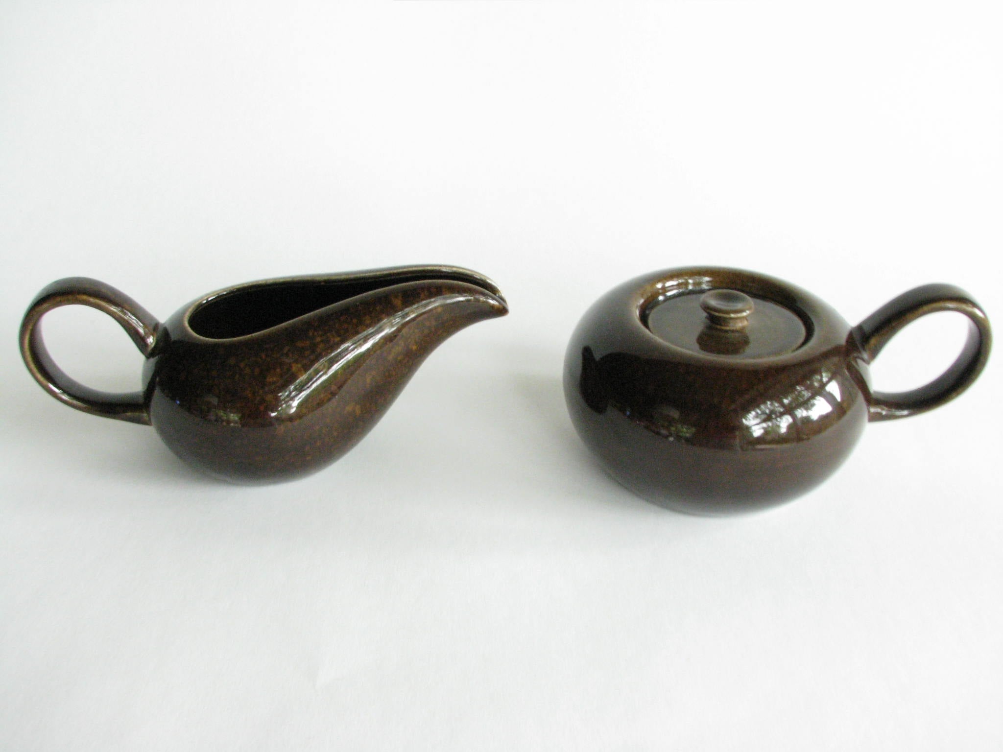 Iconic Russel Wright American Modern creamer and sugar set in Black Chutney. High gloss finish and in excellent vintage condition.