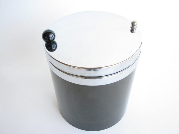 Vintage swivel top plastic double insulated ice bucket with polished stainless steel detail. Dark smoked gray / brown color.