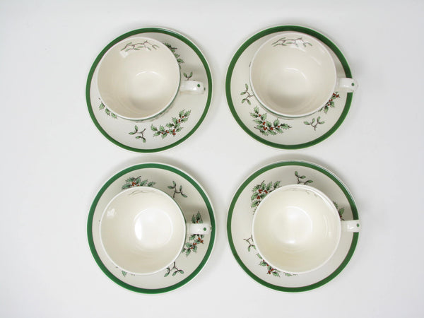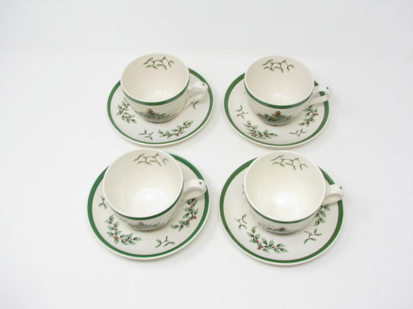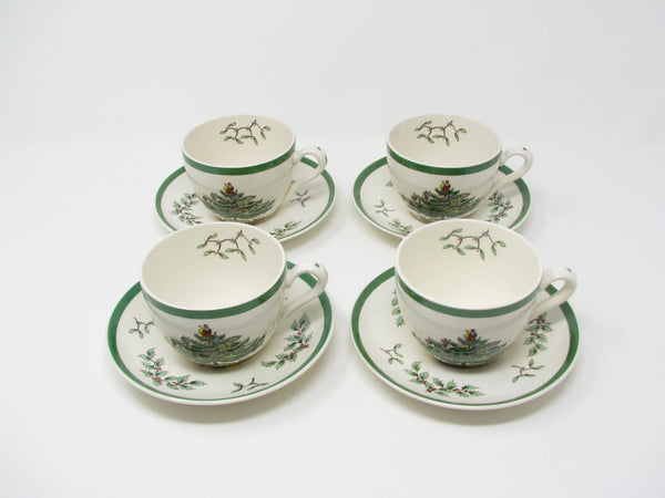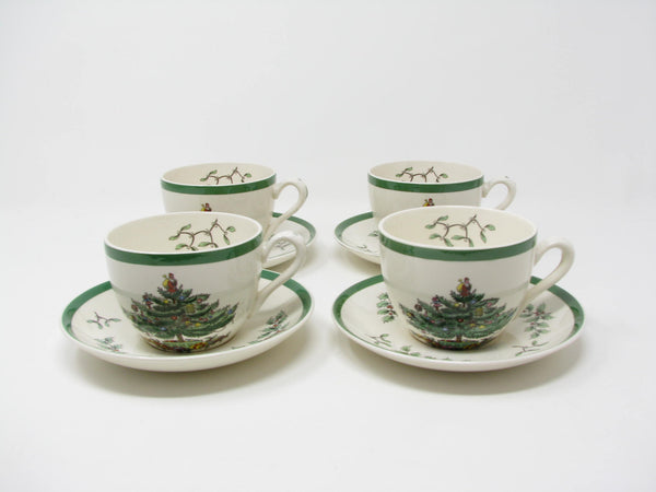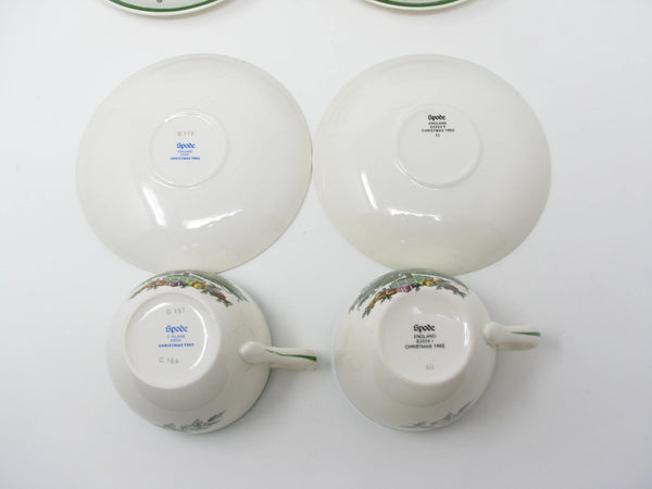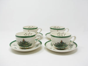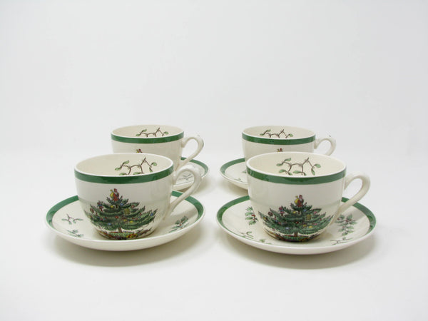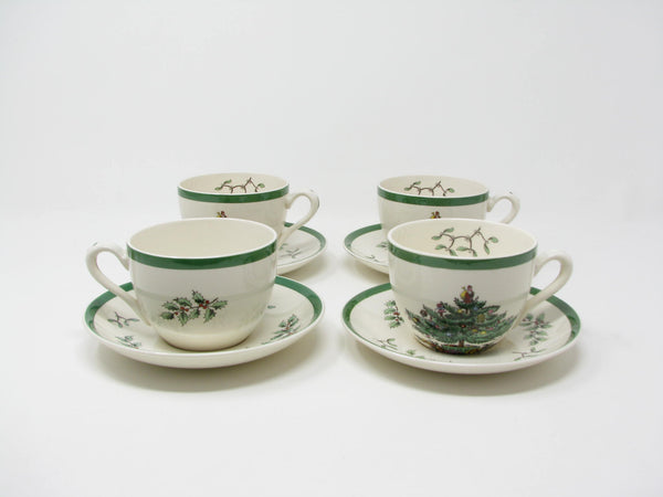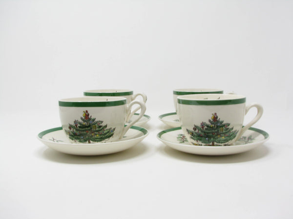 Vintage Spode Christmas Tree earthenware cups and saucers with traditional Christmas tree design and green trim. This 8 piece set includes 4 cups and 4 saucers. There are 2 sets available for purchase.