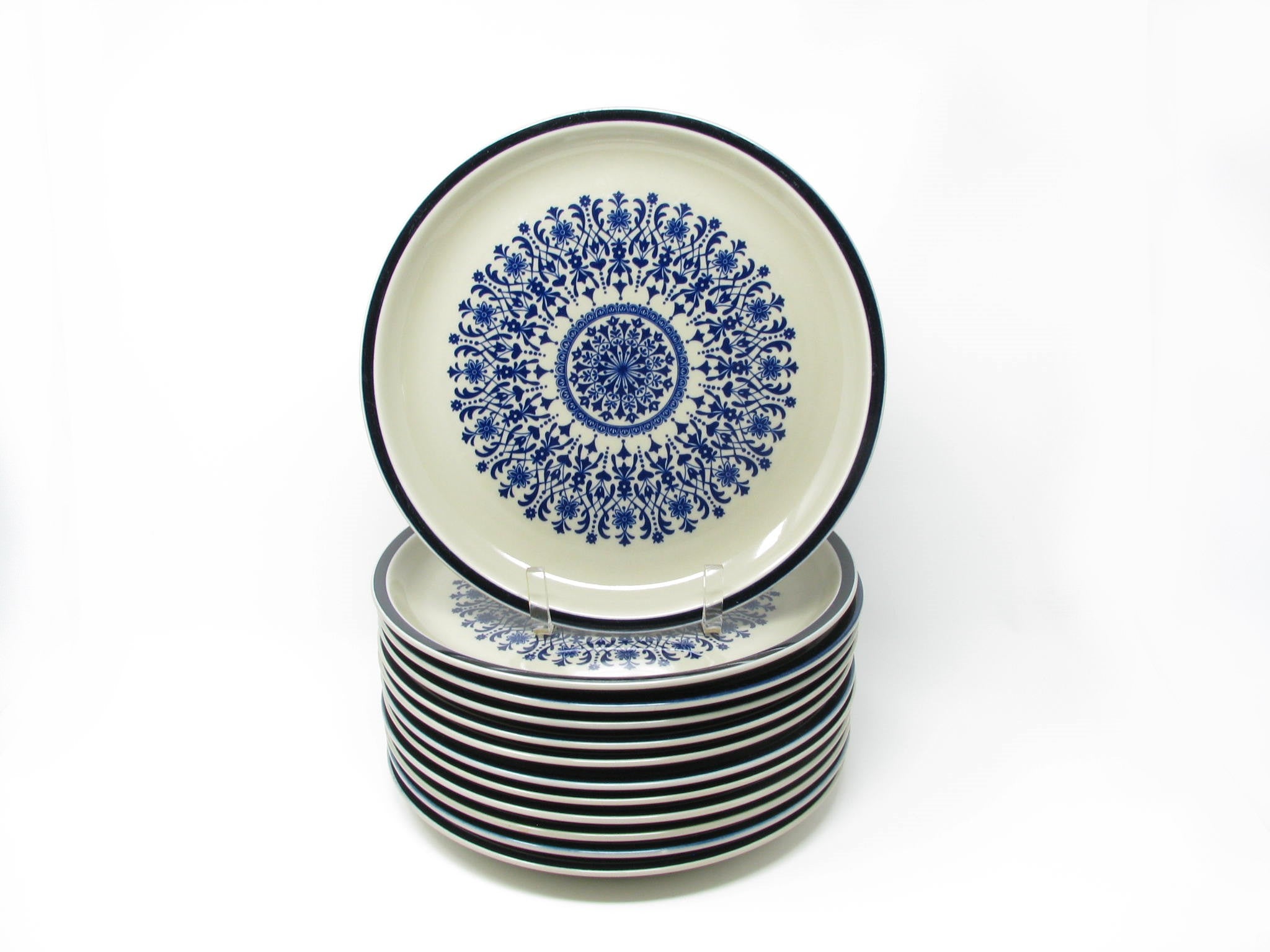 Vintage set of 12 stoneware dinner plates with blue medallion center and trim. Stunning pattern.