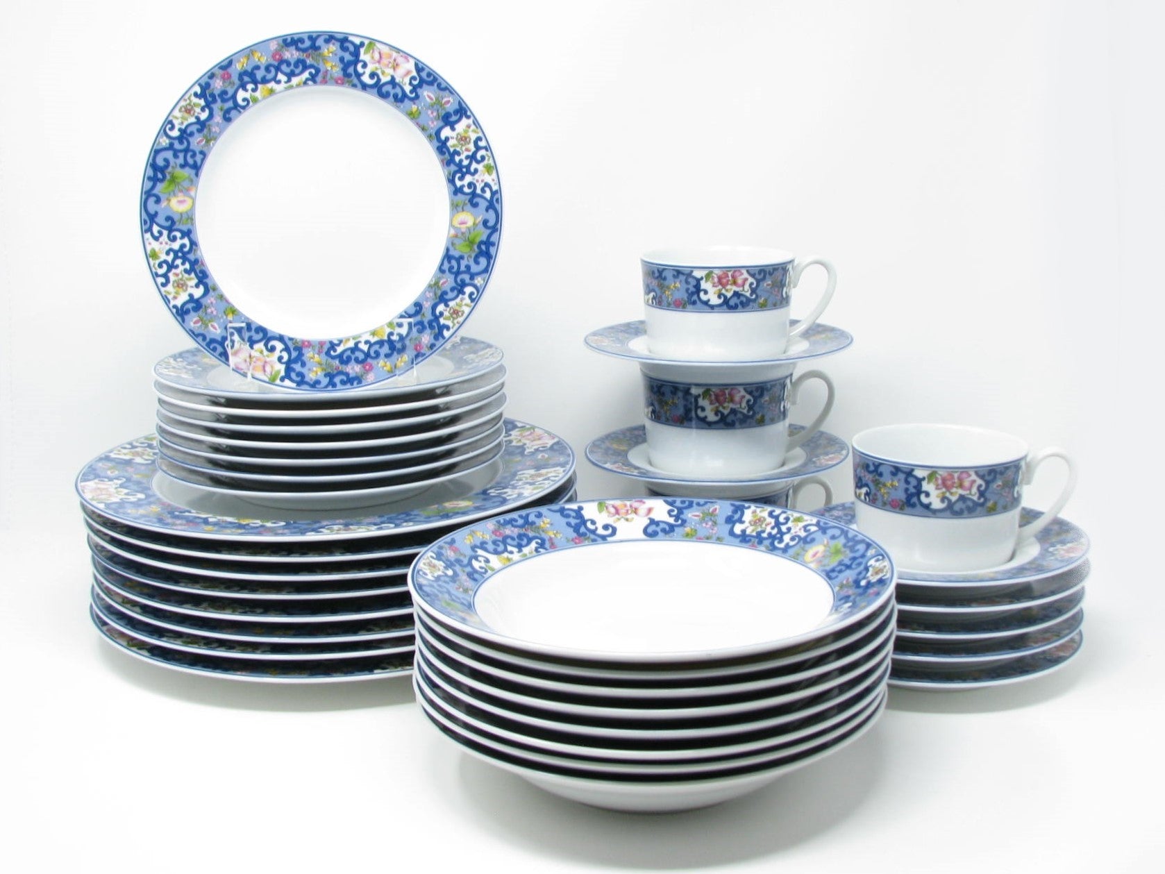 Vintage Studio Nova Angelique porcelain dinnerware set with blue band rim, floral and scroll pattern designed by Lucilla Cionini. This 36 piece set includes 8 dinner plates, 8 salad plates, 8 bowls, 8 saucers / bread plates, and 4 cups.