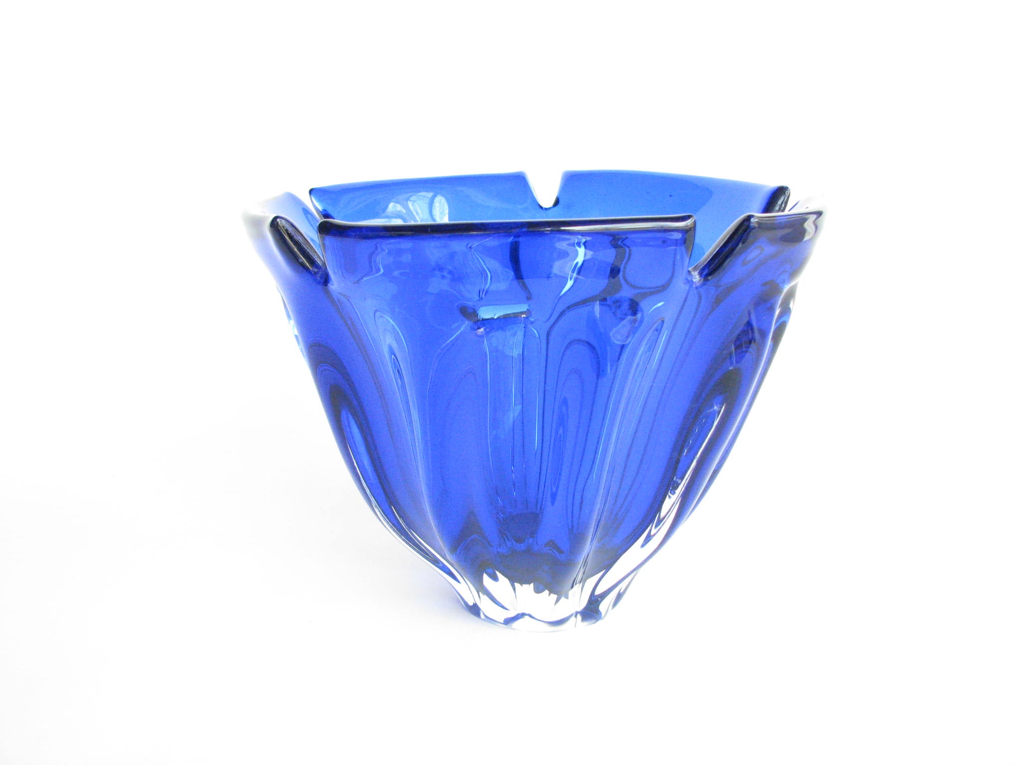 Beautifully handcrafted art glass tall centerpiece bowl with clipped corner petal design. Thick glass, stunning shape and deep cobalt color.