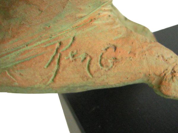Vintage terracotta plaster sculpture of woman on horse signed by artist Ken G. on a wood stand. Although unmarked this may be an Austin Productions sculpture.