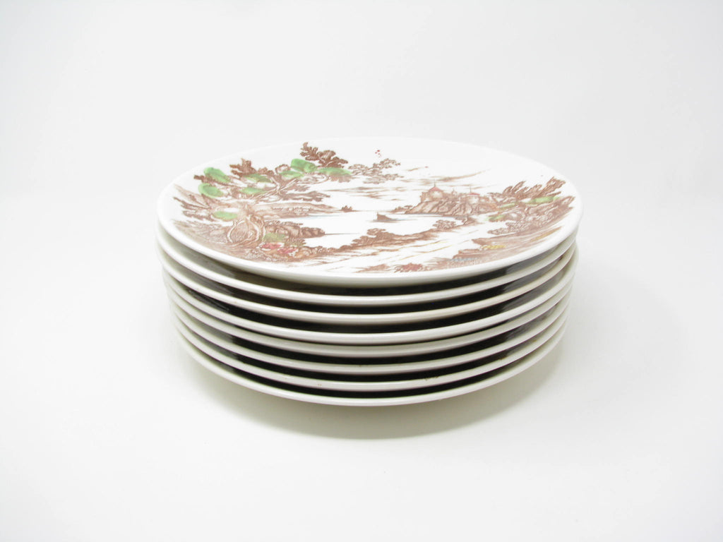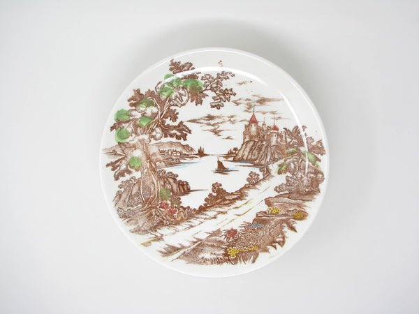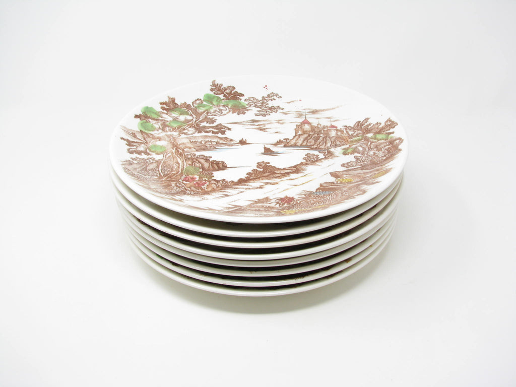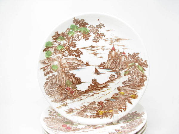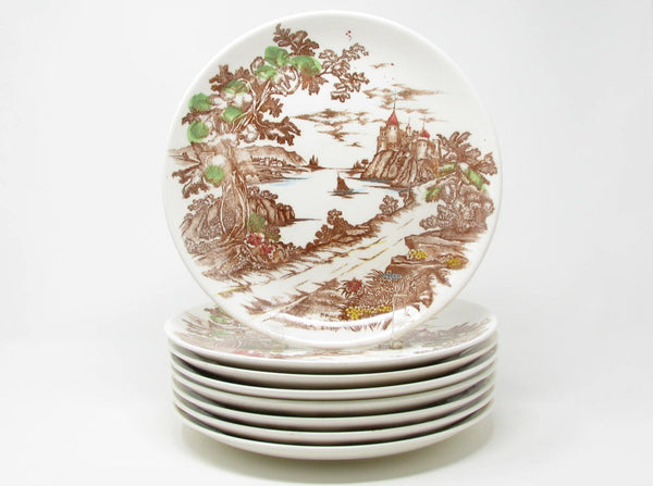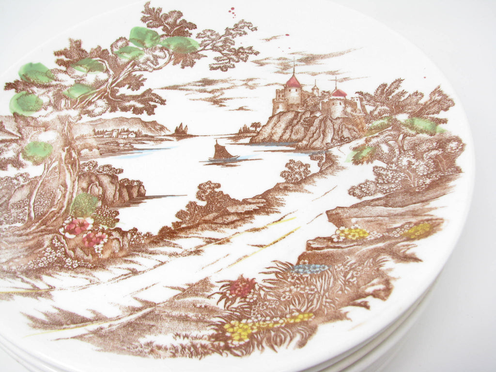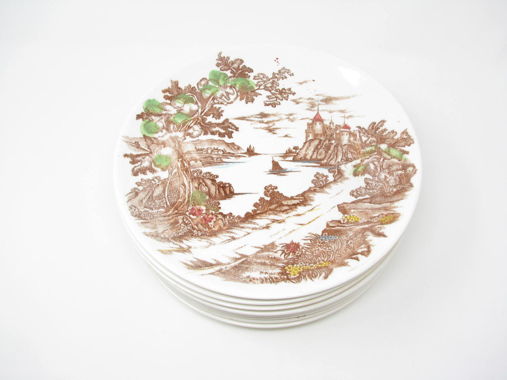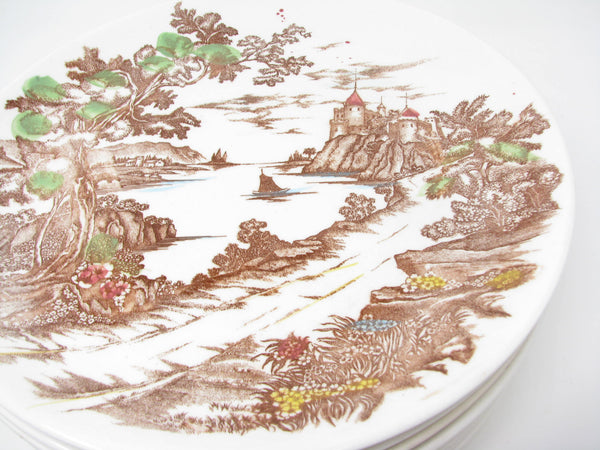 Vintage Ucagco Royal Vista dinner plates with coastal castle scene. Made in Japan. Set includes 8 dinner plates. Similar to the Royal Sealy Chateau Paulson pattern.