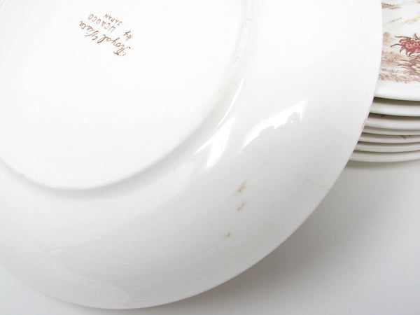 Damage or Points of Notice: Overall very good vintage condition appropriate with age and light use. All plates with transparent crazing, three plates with a few areas of darker crazing. One plate with chipped dry foot (ring on bottom), which is unnoticeable when in use. One plate with hairline crack along bottom. Priced accordingly. No other chips, cracks, or imperfections noted.