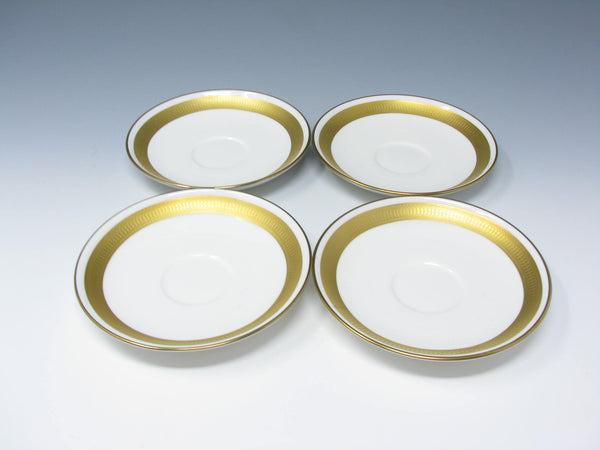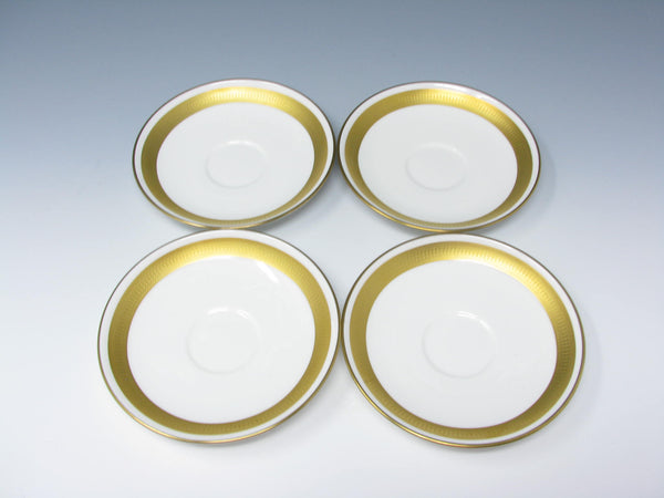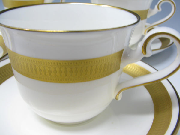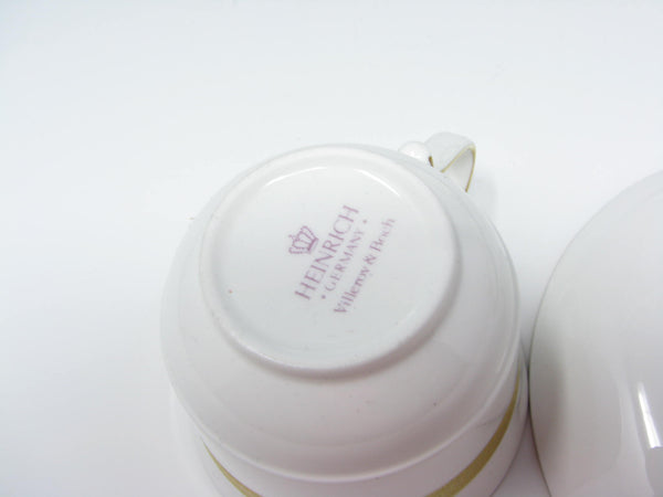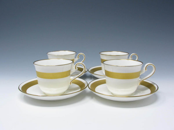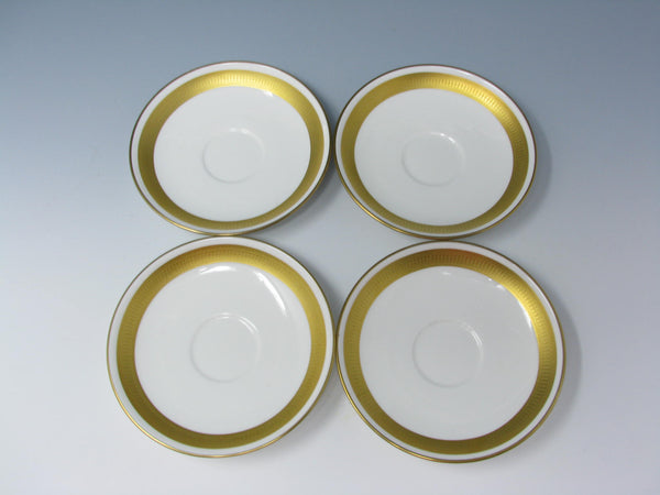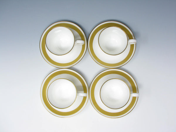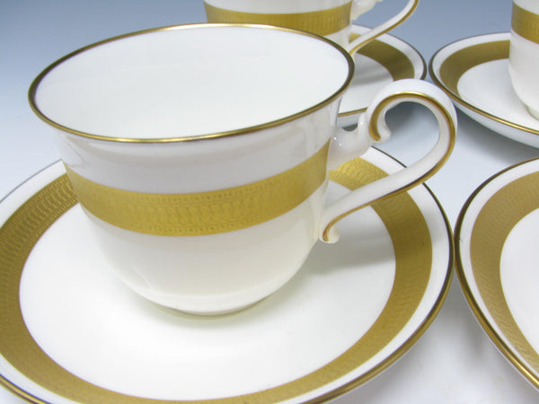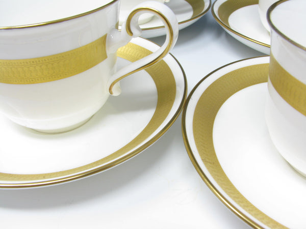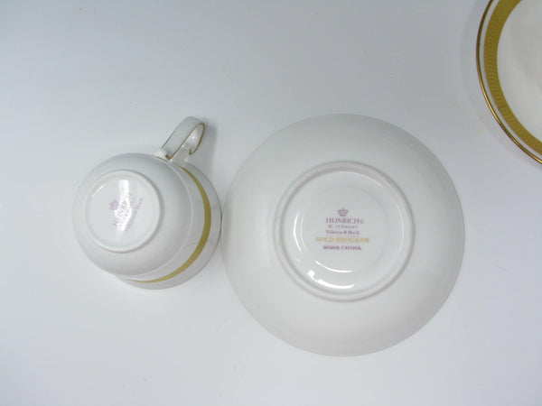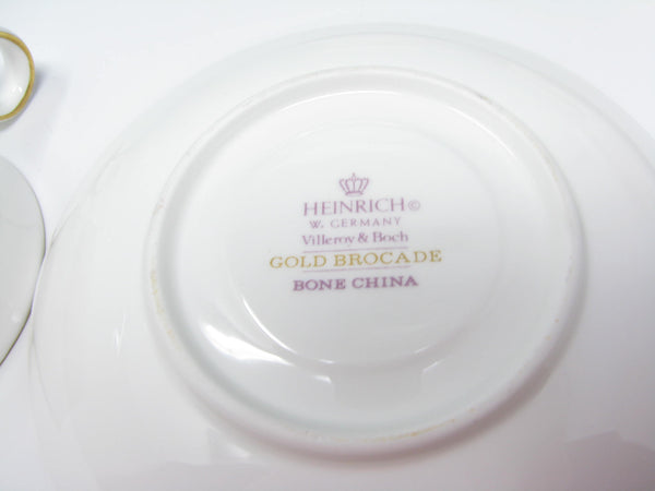 Vintage set of 4 Villeroy & Boch (Heinrich) Gold Brocade porcelain demitasse cups and saucers with gold band trim (includes 4 cups and 4 saucers).