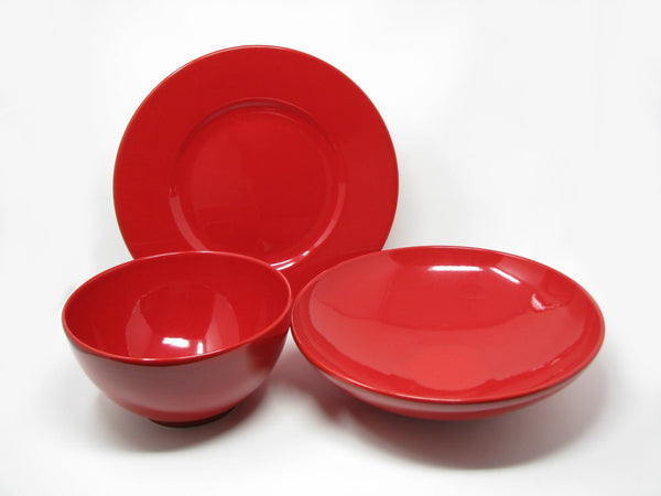 Vintage Waechtersbach Germany red glazed pottery serving bowls and platter. Set includes 1 large shallow serving bowl, 1 serving bowl, and 1 platter/service plate.