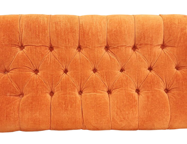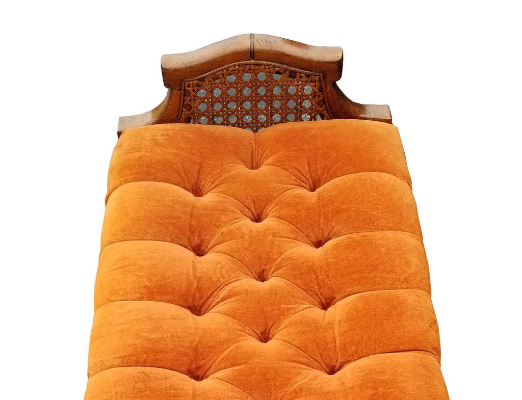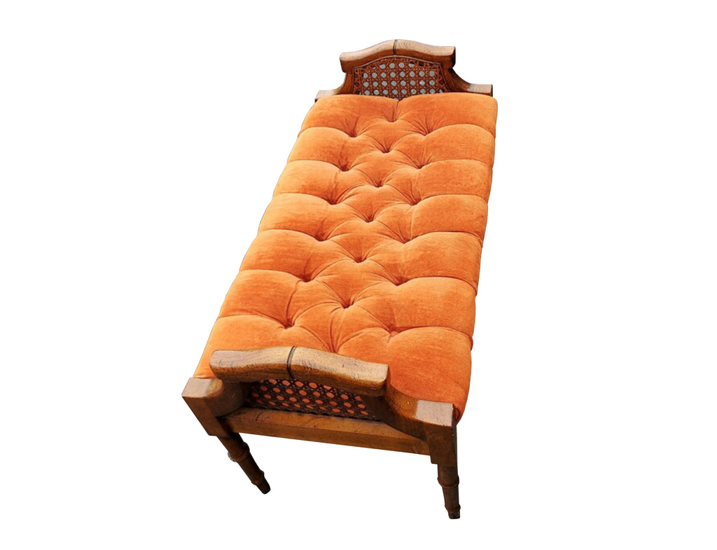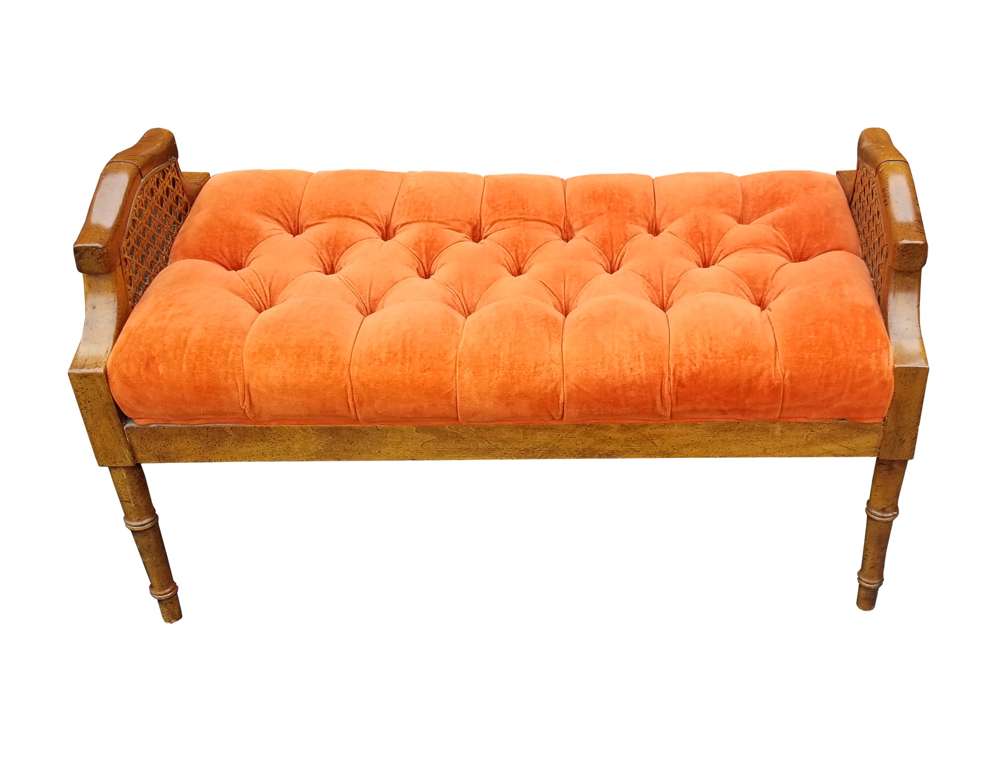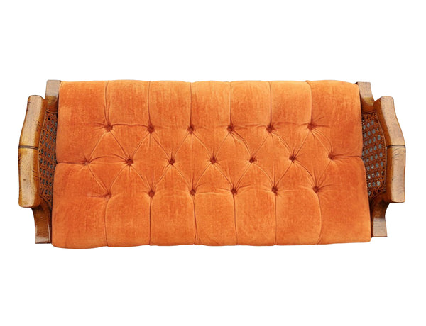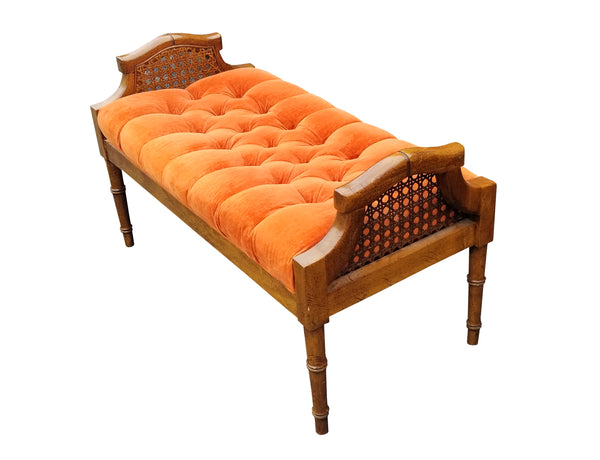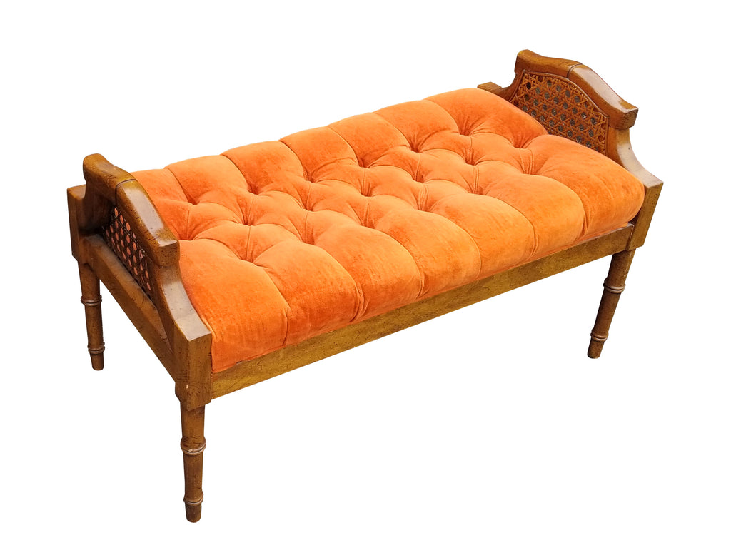 Vintage walnut bench with cane sides. Upholstered in an orange corded velvet, button tufted.