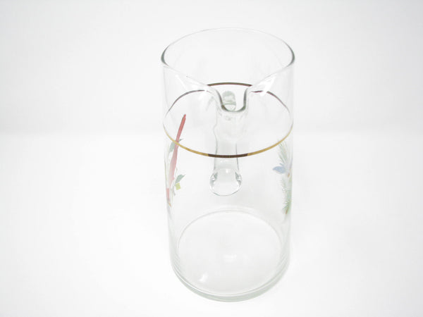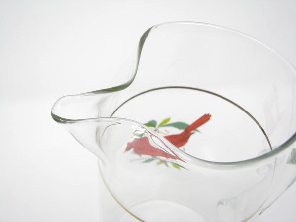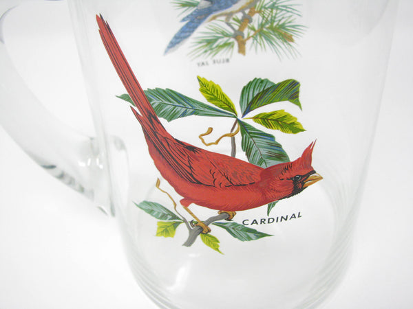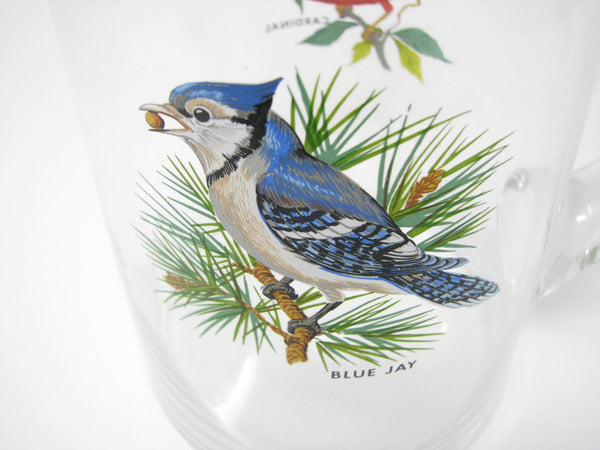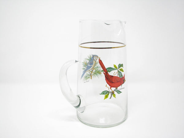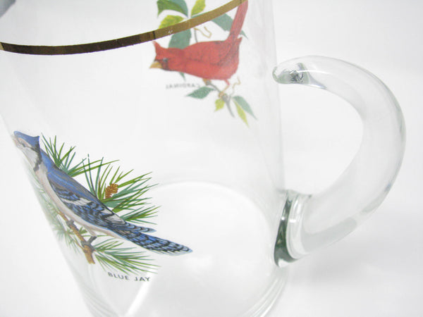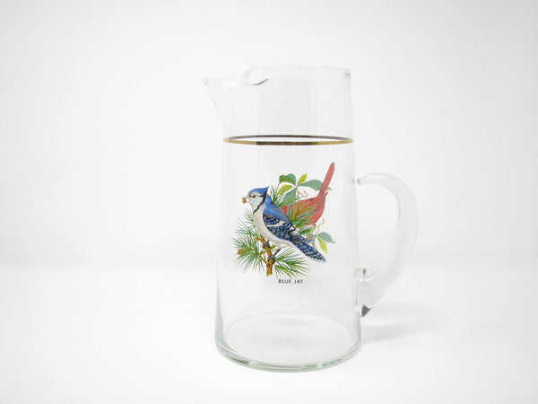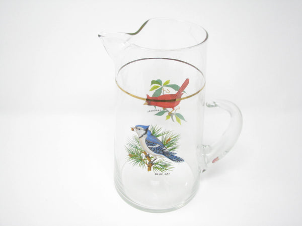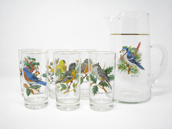 Vintage West Virginia Glass Specialty 'American Songbird' glass set including 8 plates, 6 flat tumblers, and 1 pitcher featuring popular North American birds (Blue Bird, Goldfinch, Robin, Scarlet Tanager, Baltimore Oriole, Tufted Titmouse, Blue Jay and Cardinal).
