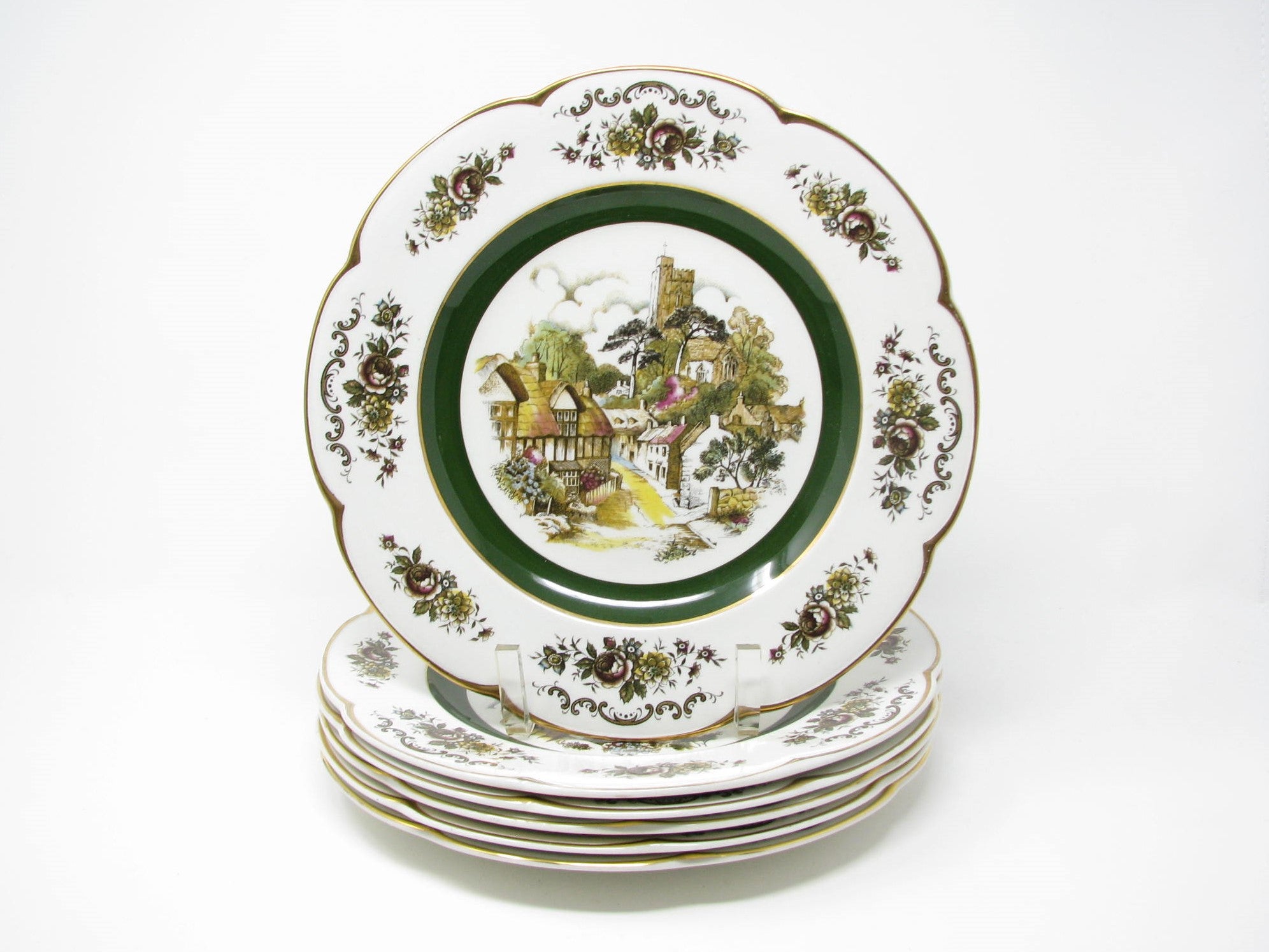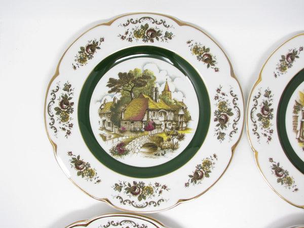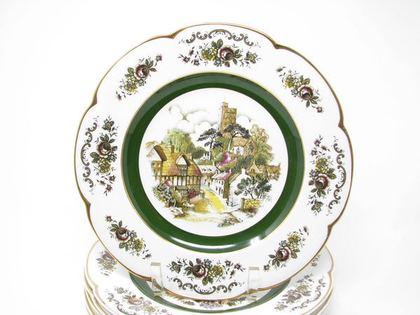 Vintage Wood & Sons Ascot Village scalloped service plates / chargers with village scenes, green bands and gold trim. Set includes 10 plates. Made in England.